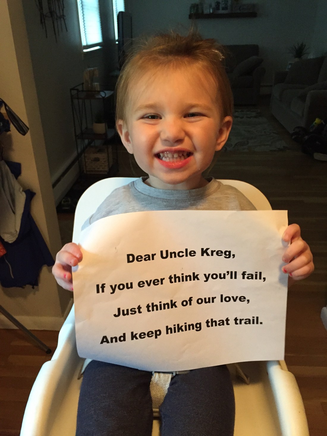 Matthew will be bigger when I get back. Gabby will be walking. Mia speaking (even more) full sentences. Michael and Grace rounding the corner to pre-school graduation. It’s hard sometimes to think that I am missing some of this to be on trail. But Katie and Krista keep me in the loop. This is the best trail magic they could give.