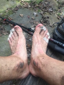 Despite decent weather for me over these last few days, the ground is still very wet. It’s hard to keep my feet dry, and they’re slowly morphing into a mass of blisters and abrasions. I have to tape up each individual toe whenever I take my shoes off: