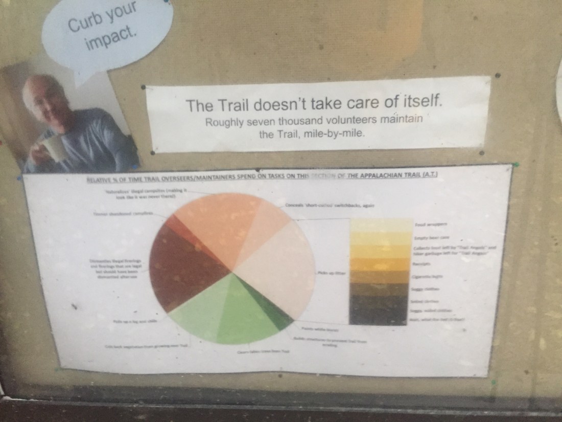 I must also say that I am continually impressed by the PATC’s (Potomac Appalachian Trail Club) consistently excellent maintenance of the trail over the last several hundred miles. I found my favorite bulletin board on trail, complete with data and graphics: