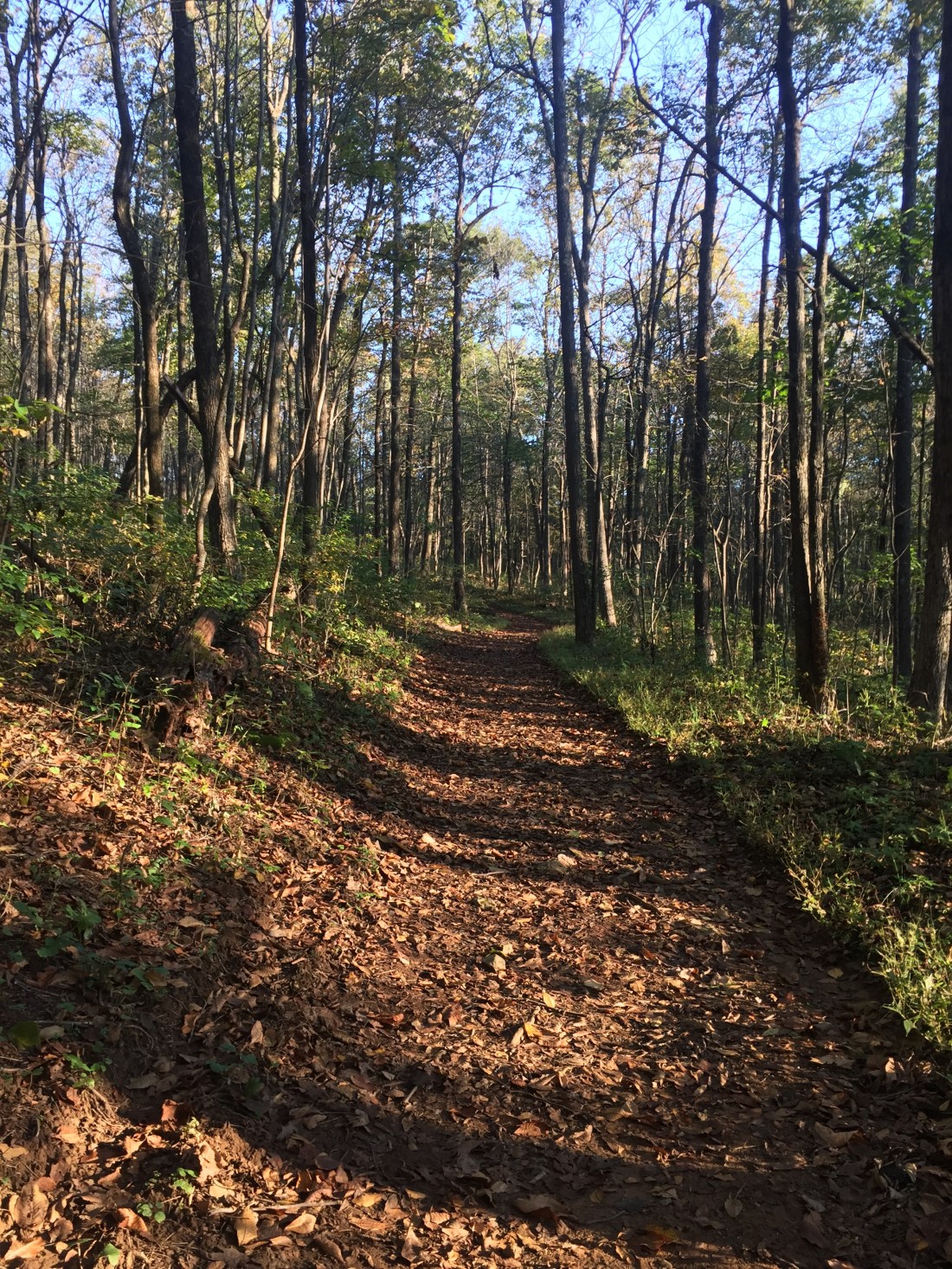 The trail, scattered with leaves of different colors, consists of lovely rolling hills.