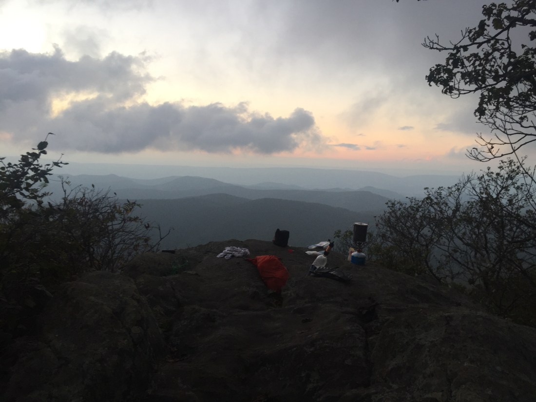 Sonic and I hiked separately through the rest of the day, and I came across a couple walking their dog who pointed out a great stealth spot at the top of a mountain just a few miles short of our intended shelter. The woman kindly gave me what was left of her water (I only had a liter for the night), and I set up camp at the spot she’d pointed out. Once Sonic arrived, we enjoyed dinner while watching what was left of the sunset – not a bad change-up from shelter-hopping.