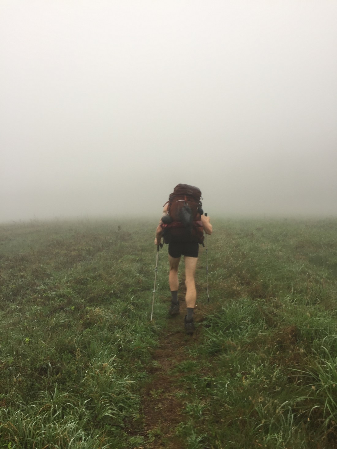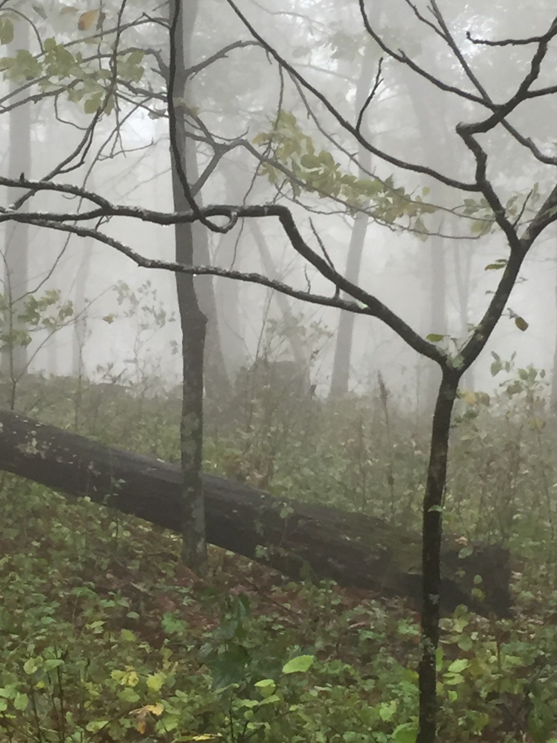 But it also meant that I could hear the low grunt off to the side of the trail around mile 22. I looked up to see a momma black bear prowling about 15 feet to my left. With a quick “holy ****”, I pranced backward away from her. Completely unbothered, she meandered a bit further away. Pretty soon, two cubs joined her in the distance. My best picture through the fog only captures them as little brown bumps in the distance.